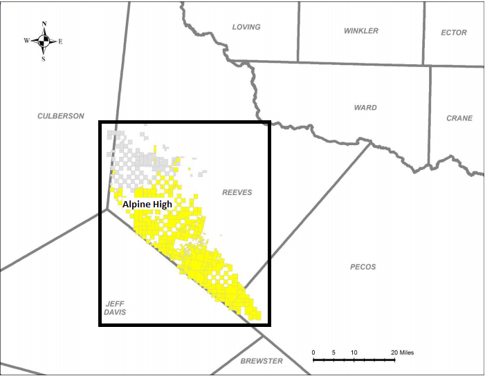 At the high end of the potential development spectrum, completing 153 wells per year, each with a 10,000 ft lateral length (drilled by a 12-rig program), could require an average of approximately 200 thousand barrels per day of water. Two hundred thousand barrels of water is roughly 26 acre-feet (i.e. enough to cover 26 acres under 1 foot of water). Translated into practical farm irrigation terms, that is roughly equivalent to a sprinkler system putting 1 inch of water onto a 310 acre farm. Southern Reeves County, where much of the Alpine High acreage sits, has numerous farms that are bigger than 310 acres, and whose water needs during hot dry spells can, in aggregate, significantly exceed even a high-end oilfield Alpine High frac water demand scenario.